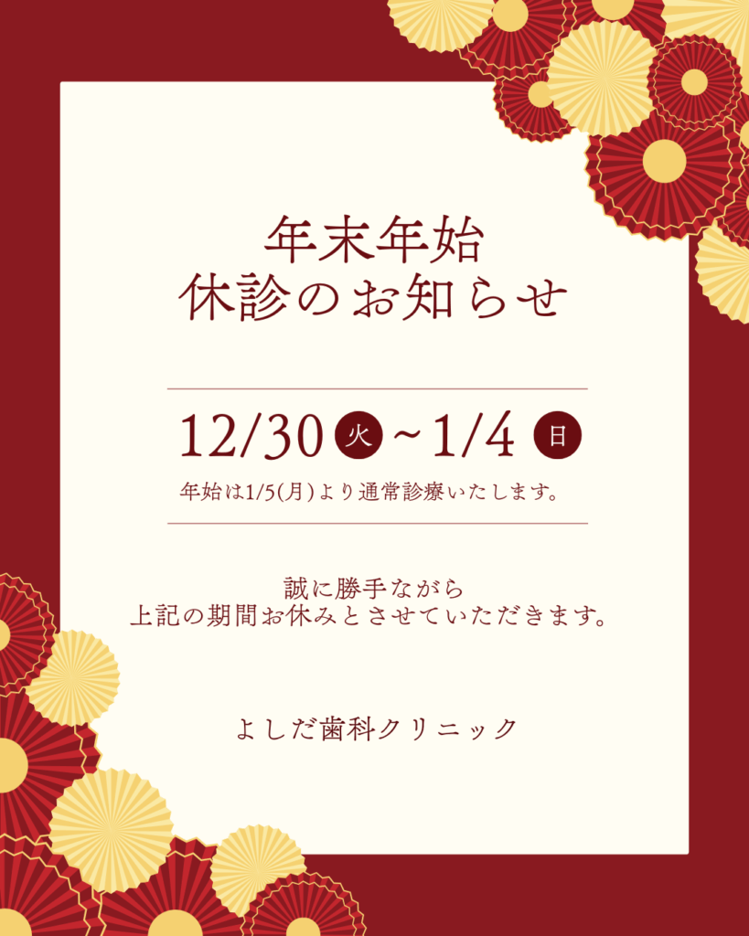 年末の診療は、12月29日(月)まで行います。12月30日(火)より1月4日(日)まで年末年始のため、診療を休診いたします。